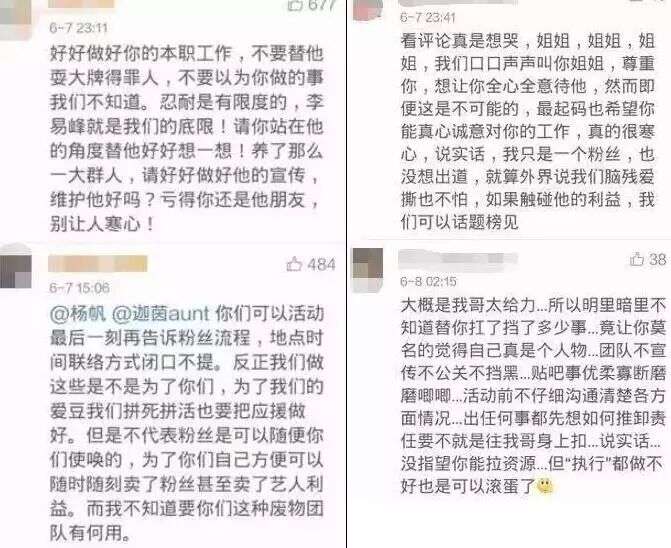 事情是这样的,前两天,“李易峰粉丝团”的微博突然发出一篇长文,要求李易峰的经纪公司欢瑞世纪开除其经纪人和团队。粉丝团列举出了经纪人的一长串罪状,其中包括业务生疏、缺乏底线、对待合作方态度不好、媒体关系处理不当、对待艺人切身问题敷衍了事、对待过失推诿等等,大意就是作为经纪人你不作为就算了,还要给wuli峰峰抹黑。