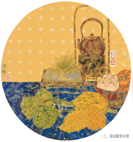 采用撞水撞色撞粉等技法,最大程度的表现中国画水性颜料透明的特性,用水、墨、色交融的中国画笔墨特点与工笔画的严谨细腻相结合,展现灵动活泼与细节描绘相结合的工笔画,这样的表现方式也体现了艺术家对当下的中国画世界语境的审美追求。