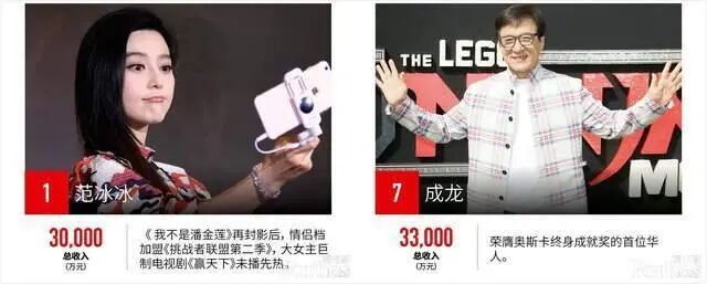 此外,在2018年福布斯TOP100人名单中,成龙以4500万美元,约合3亿人民币收入,位列排行榜第67位,也是唯一进入榜单的华人明星。2017福布斯中国名人榜中,成龙以3.3亿元的年收入位列榜单第7位,超过综合排名第一“巅峰时期”范冰冰的3亿元收入。