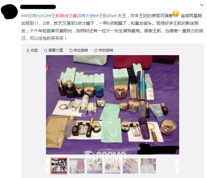 王凯成为雅诗兰黛品牌大使这个消息,可是首先从粉丝口中得知的……重庆等地相继在专柜有了人形牌和广告板,满额还会增王凯的明信片!于是乎饭们纷纷不淡定 了,各地粉丝倾巢出动围追雅诗兰黛,甚至有人买到五位数然后狂刷高eyeQ女生话题……感觉贵圈竞争也是有一些巨大。先来感受这满屏的英俊儒雅之气: