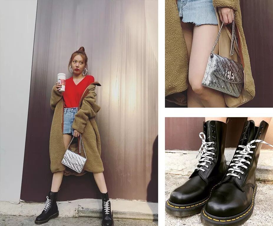 马丁靴的可塑性强,既能搭配风衣也能搭配摇粒绒毛绒外套,软萌中还有一些小个性,正红色和银色这对CP搭在一起让人眼前一亮。