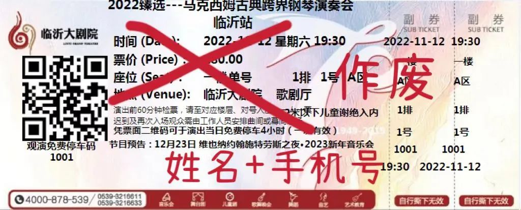 如因演出变更需要退票的观众,即日起至4月27日16:00,您可在线联系临沂大剧院会员助手小艺办理退票,退款将于4月27日后10个工作内退还至原账户。如您未打印纸质门票,剧院工作人员可直接通过线上操作为您办理退款;如您已取得纸质门票,可如下图所示在门票上打叉,并标注“作废”字样,同时在票面上留下您的姓名和电话,拍摄清晰照片发送至小艺微信,我们的客服人员同样会为您办理线上退款。