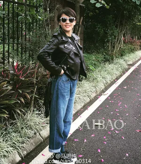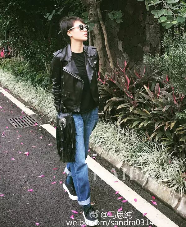 马思纯小妮子微博Po照秀私服,皮衣+男友裤的Look有点拖沓还显得比例不是很好,再配上一个流苏包包更是乱糟糟!