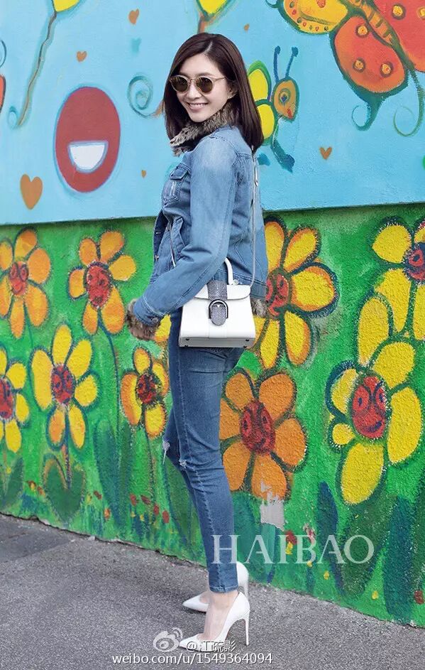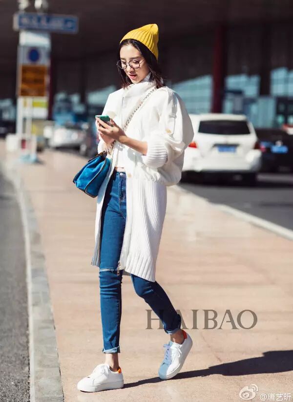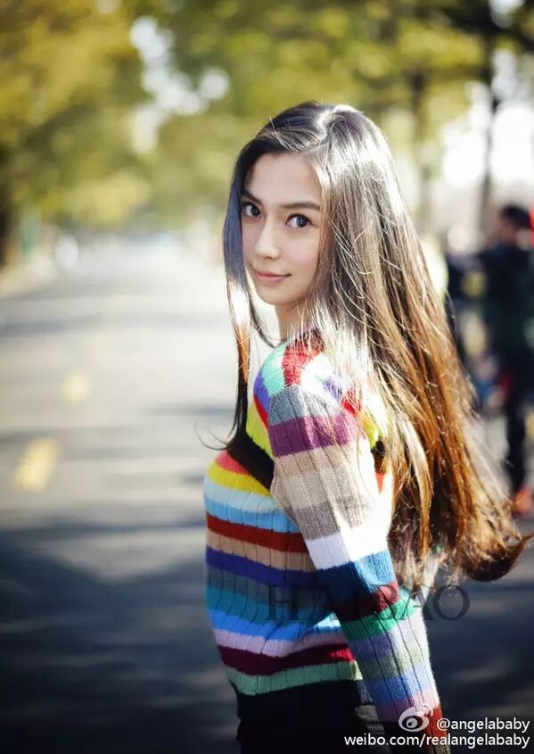 好久不见的AngelaBaby来报到,彩色毛衣配牛仔裤的Look青春十足!
