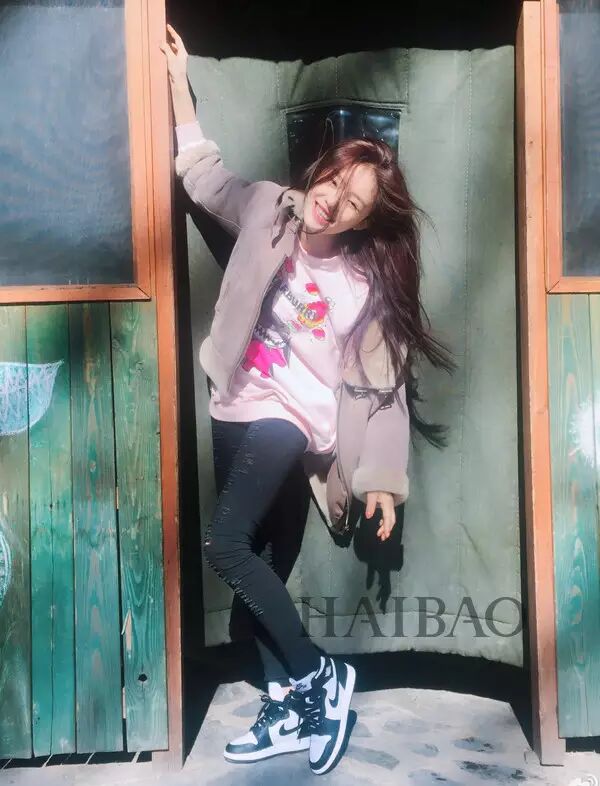 96年的林允确实青春无敌,穿衣也是活力十足,汤丽柏琦 (Tory Burch) 红色毛衣配黑色牛仔裤和马丁靴挺Ok!