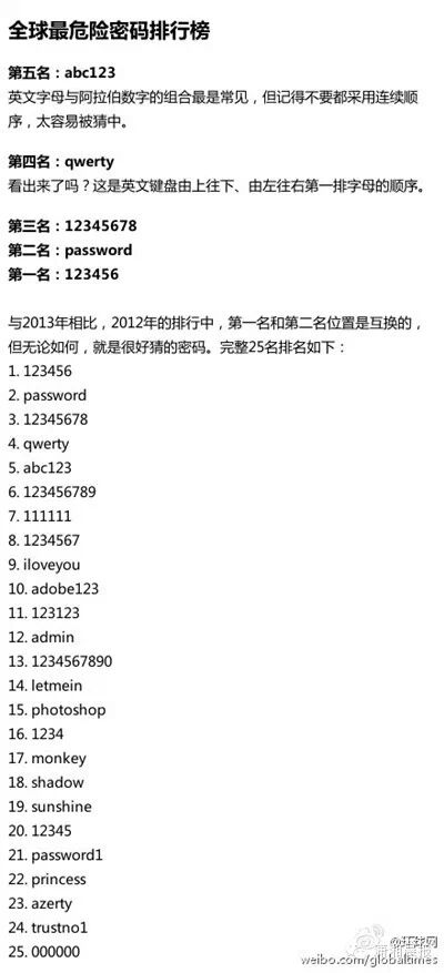 日前好莱坞女星们爆出“艳照门”,储存在“云端”的私密照片遭到破解大量流出,引发全球关注,密码设定的重要性再次被提及。美国“SplashData”公司日前公布了《2013年全球最危险用户密码排行》,赶快看看自己的密码是不是也在其中,可以就换了吧。