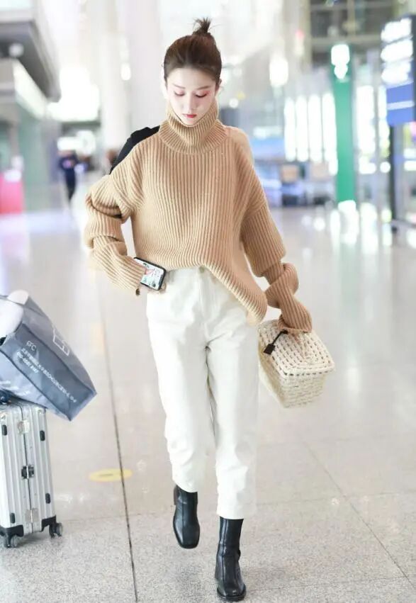 色系搭配在时尚表现力中的地位是十分重要的,虽说秋冬以气质深色为主,偶尔尝试浅色调也会让人感觉十分清新。用oversized的卡其色高领针织衫来搭配修身白色牛仔裤,高领的设计防风又保暖,搭配上垂感自然的oversized版型更显得慵懒又随性。下搭的白色牛仔裤选择了修身版型来呼应'上厚下薄'的穿法,搭配上一双黑色短靴更显得身量纤纤。