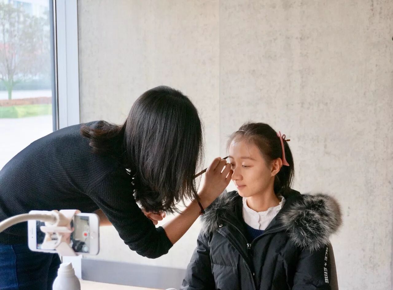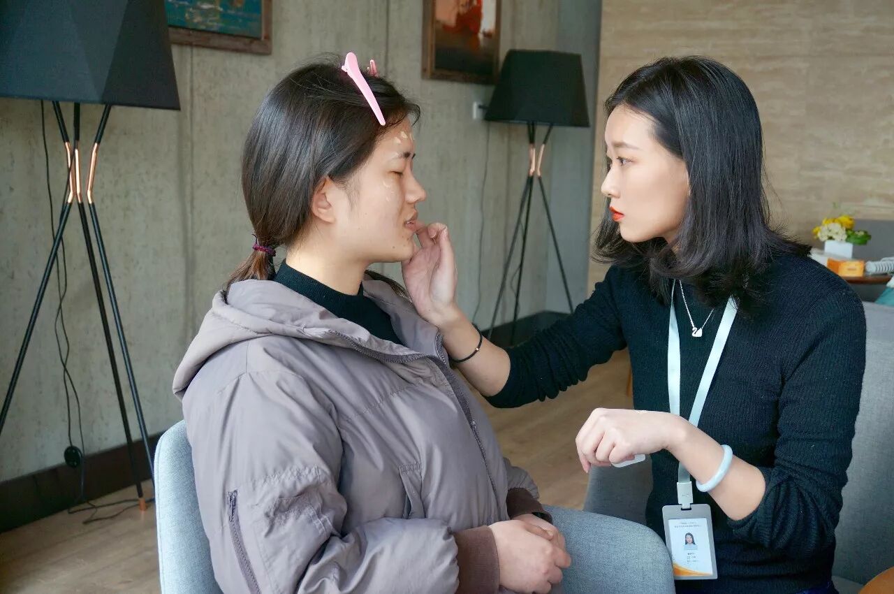 这个女生的痘印较深,为了打造出轻薄无妆、有光泽、状态好的底妆, 真的是费了很大功夫。然后搭配一点小甜蜜的粉咖色眼妆、唇妆,使得造型更有整体感。