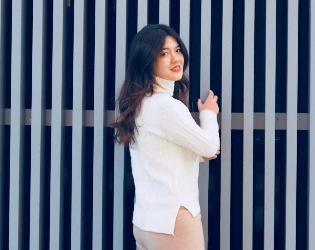 所以我选择了稍宽松但能修饰身材的白色毛衣,高领在视觉上达到了拉长身型的效果。下身米色阔腿裤宽松挡住大腿跟达成视觉欺骗。