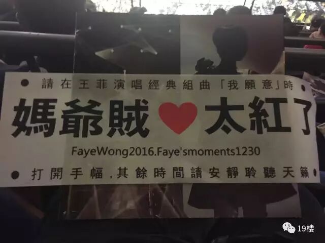 演唱会上歌迷带去的灯牌手幅都被没收了,据说要服从整体舞美效果,只在王菲唱《我愿意》的时候歌迷才举起手幅,手幅写的是“请在王菲演唱经典曲目《我愿意》时拉开手幅,其他时间请安静聆听天籁。”
