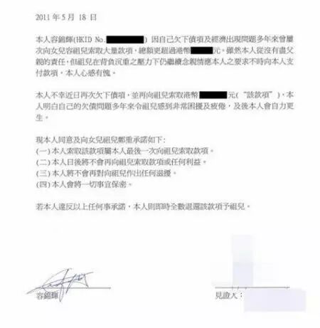 承诺书中容爸证实多次向容祖儿索取金钱,并承诺签署承诺书当日所索取的款项是最后一笔,今后不再滋扰容祖儿及索取利益~即时拆穿容爸讲大话。。。