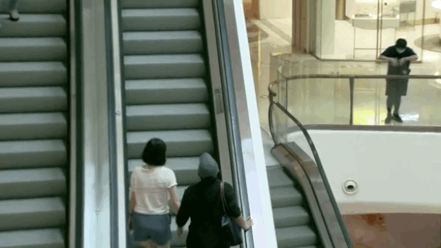 在下电梯的时候,也不忘主动去牵着她的手,给人感觉很温暖。