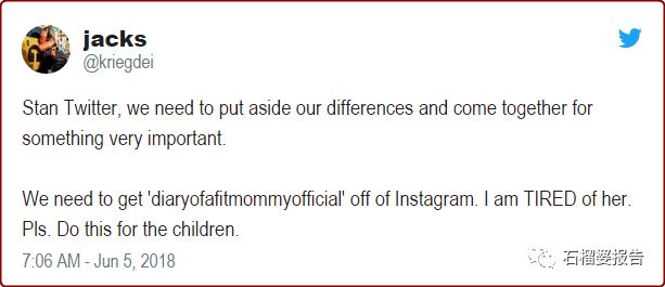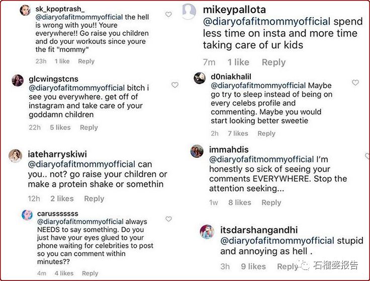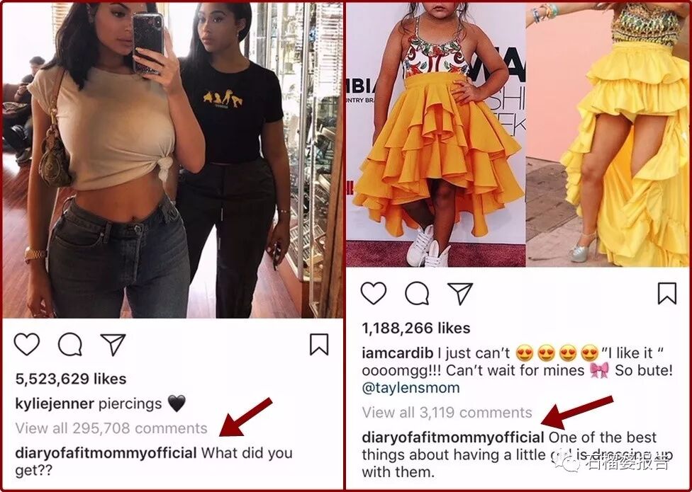 如果你经常去卡戴珊姐妹、Cardi B等名人ins页面浏览,会发现每条更新下面的第一条评论,经常都来自一个名叫@diaryofafitmommyofficial的账号。