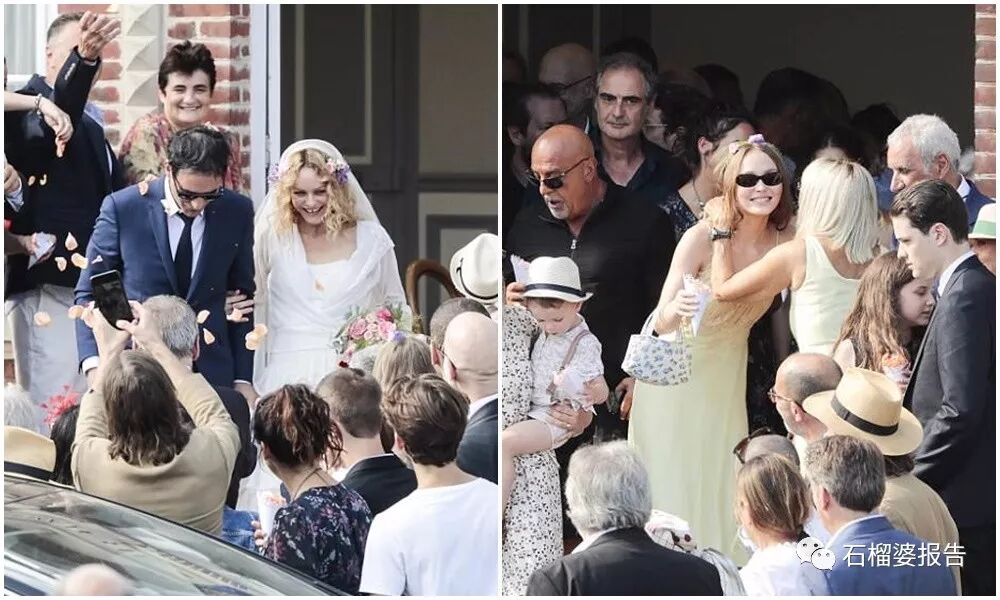 婚礼于上周六在法国举行,右图穿黄裙子的是她和戴普叔的女儿Lily-Rose。