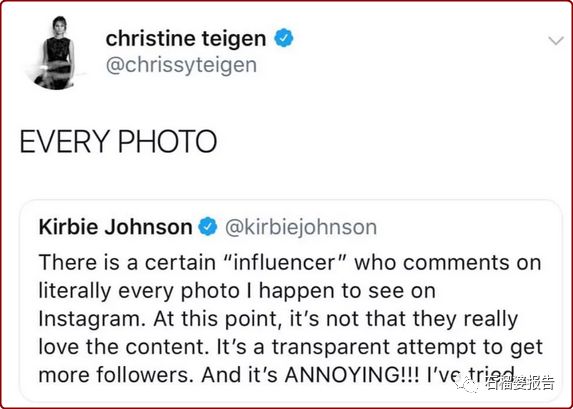 传奇哥老婆Chrissy Teigen还转发过一条吐槽推特,抱怨说ins上“每张图片”下面都能看到“健身妈妈”的身影,实在烦人。