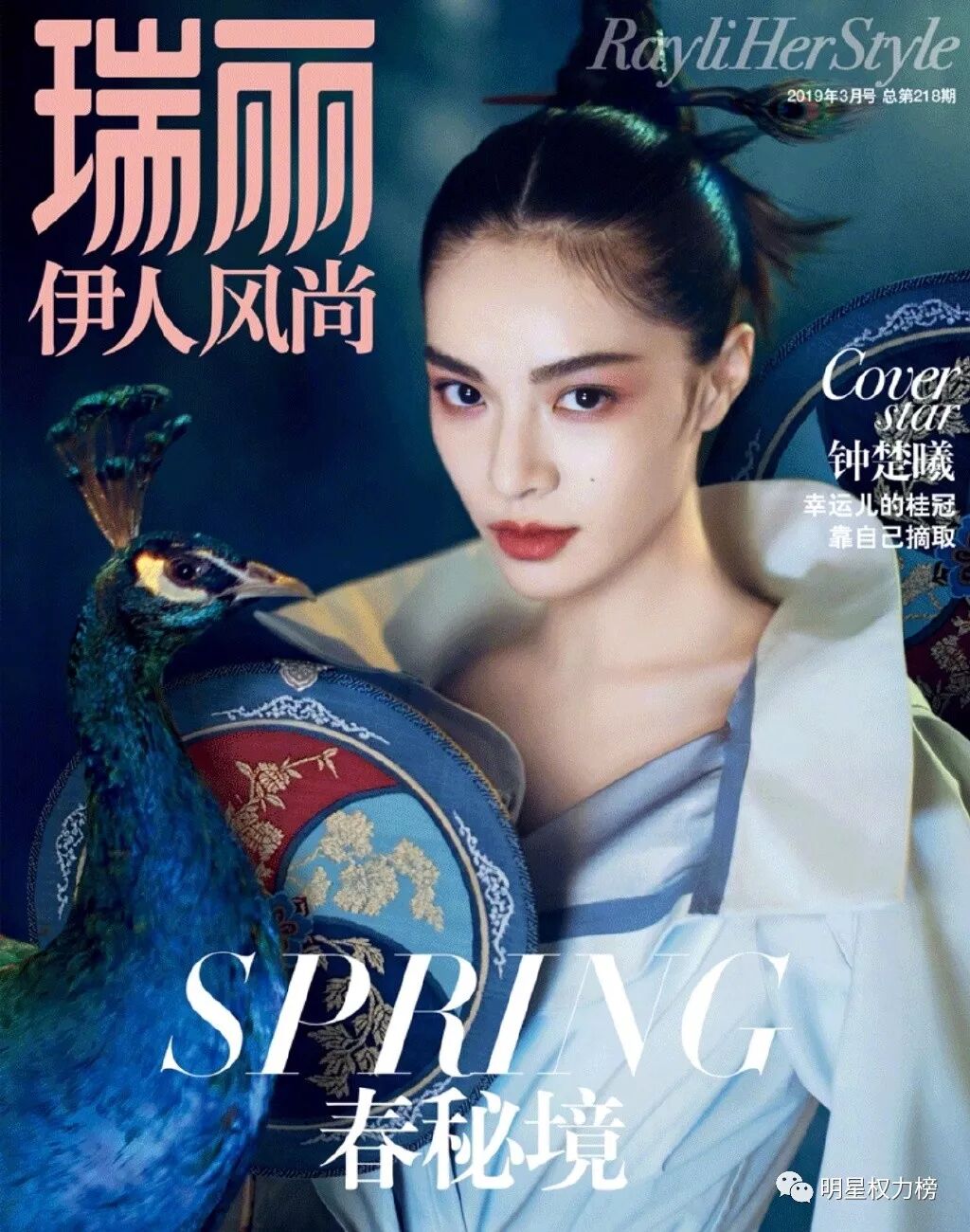 ▼ 钟楚曦《瑞丽伊人风尚》3月刊封面, 孔雀翎, 英气美。