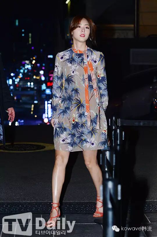 照片中,李妍熙身穿一件让人联想起夏威夷的花纹连衣裙,并以橙色丝巾加以点缀。她手提一款带有与连衣裙相似印花的迷你包和橙色系发色,搭配橙色带式凉鞋,让整体搭配看起来十分协调,展现出她优雅又干练的美貌。