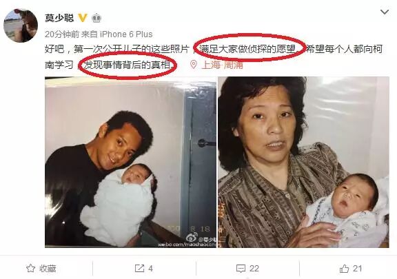 本以为这场闹剧就此收场,可是,今日莫少聪又发微博公开与儿子旧照。称“满足大家做侦探的愿望”,也希望大家“发现事情背后的真相“”。