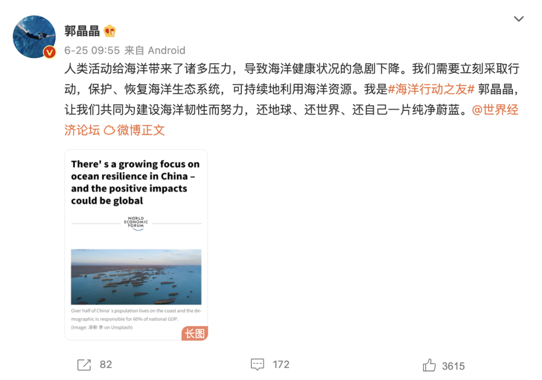 作为海洋行动之友,郭晶晶呼吁大家保护海洋生态系统,共同为建设海洋韧性而努力,还地球、还世界、还自己一片纯净蔚蓝。