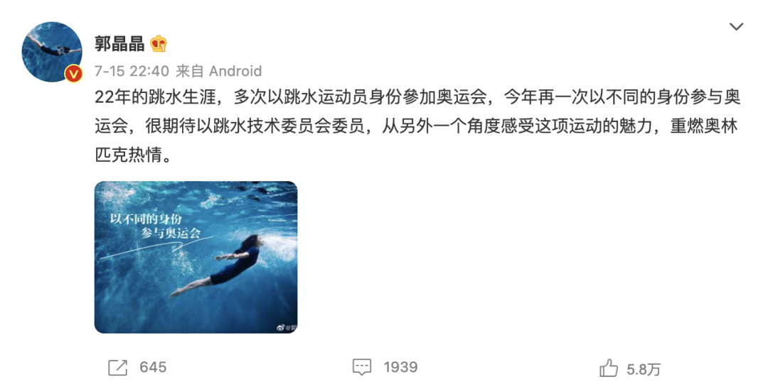 早在半个月前,郭晶晶就在自己刚刚开通不久的社交平台上透露,自己今年将以全新的身份参与奥运会。