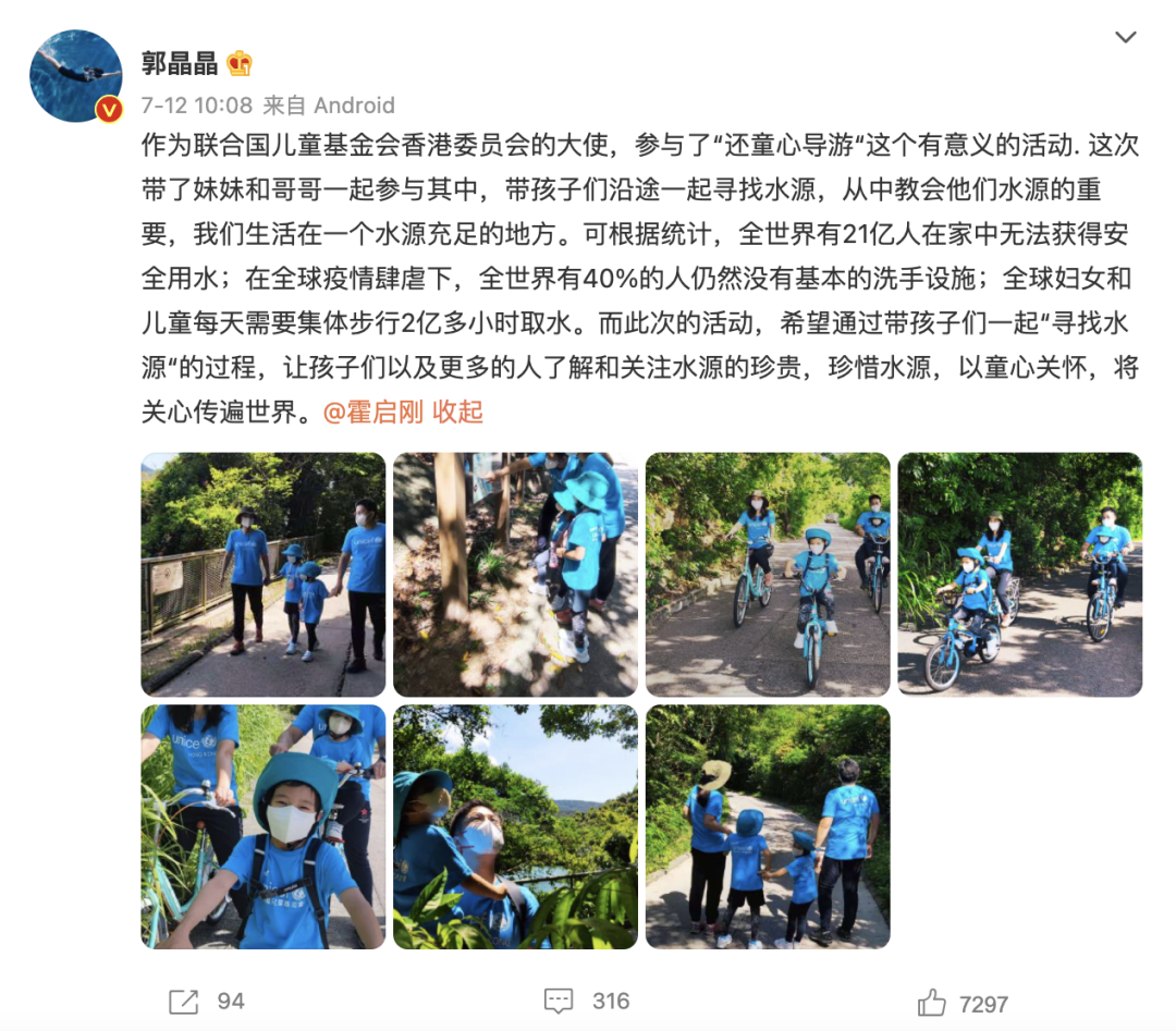 作为联合国儿童基金会香港委员会的大使,郭晶晶和丈夫带着孩子一起参与到慈善活动中,让孩子们以及更多的人了解和关注水源的珍贵,珍惜水源。