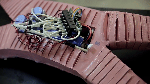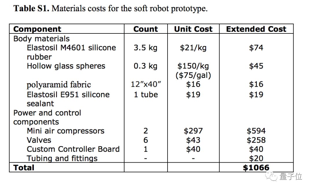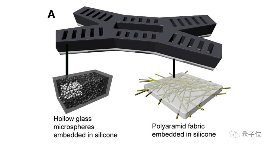 这个机器人使用了由有机弹性体、聚芳酰胺织物和空心玻璃微珠组成的复合材料制造,配有一个微型空气压缩机、电池、阀门和控制器。