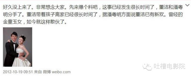 2012年,微博上的@八掌柜 爆料称,董洁和潘粤明已经分手,而且“据潘粤明方面说董洁已有新欢”。