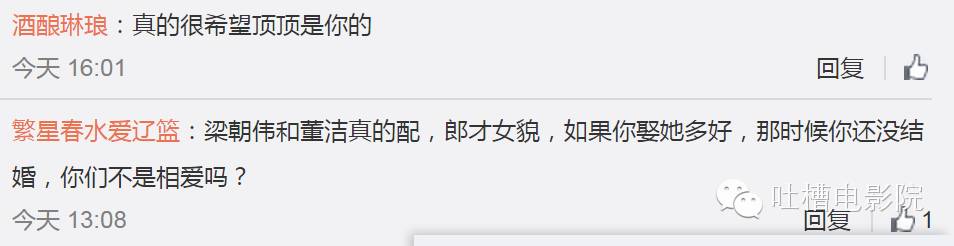 不过,院长一直觉得如果当初董洁吻的对象不是大治或者杨臣刚级别的,而是梁朝伟的颜值级别,大概群众也不会那么反感吧。