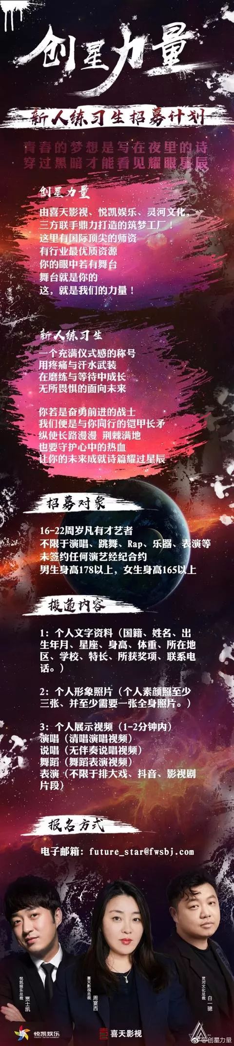 这个由喜天影视、悦凯娱乐以及灵河文化共同打造的《创星力量》已经成功推出了《新流星花园》中的陈青和刘尹昊,以及刚刚参加完央视教师节晚会的学生代表胡旭晨。