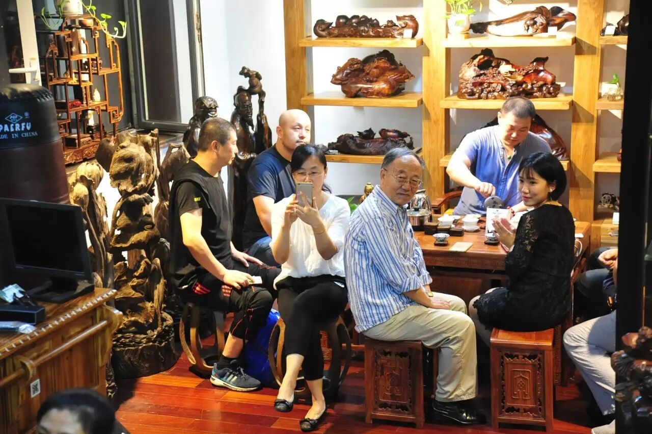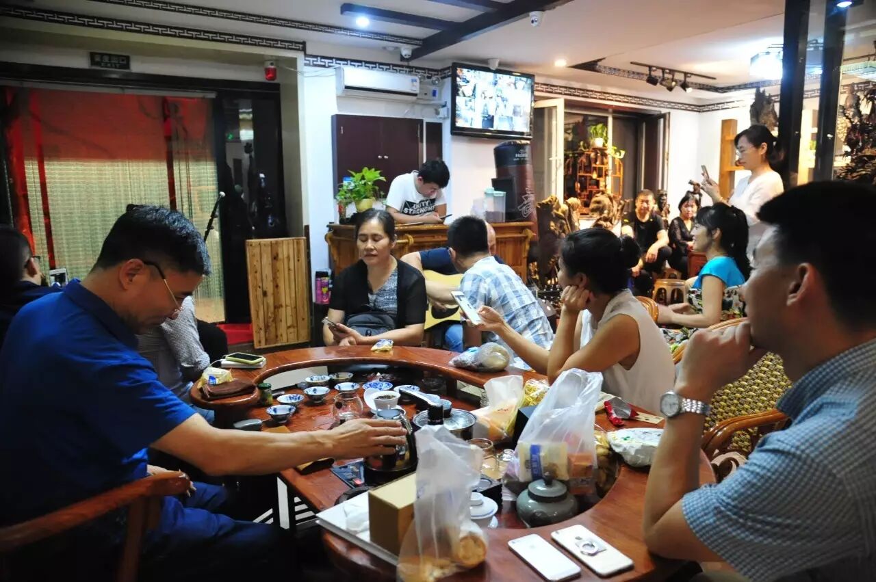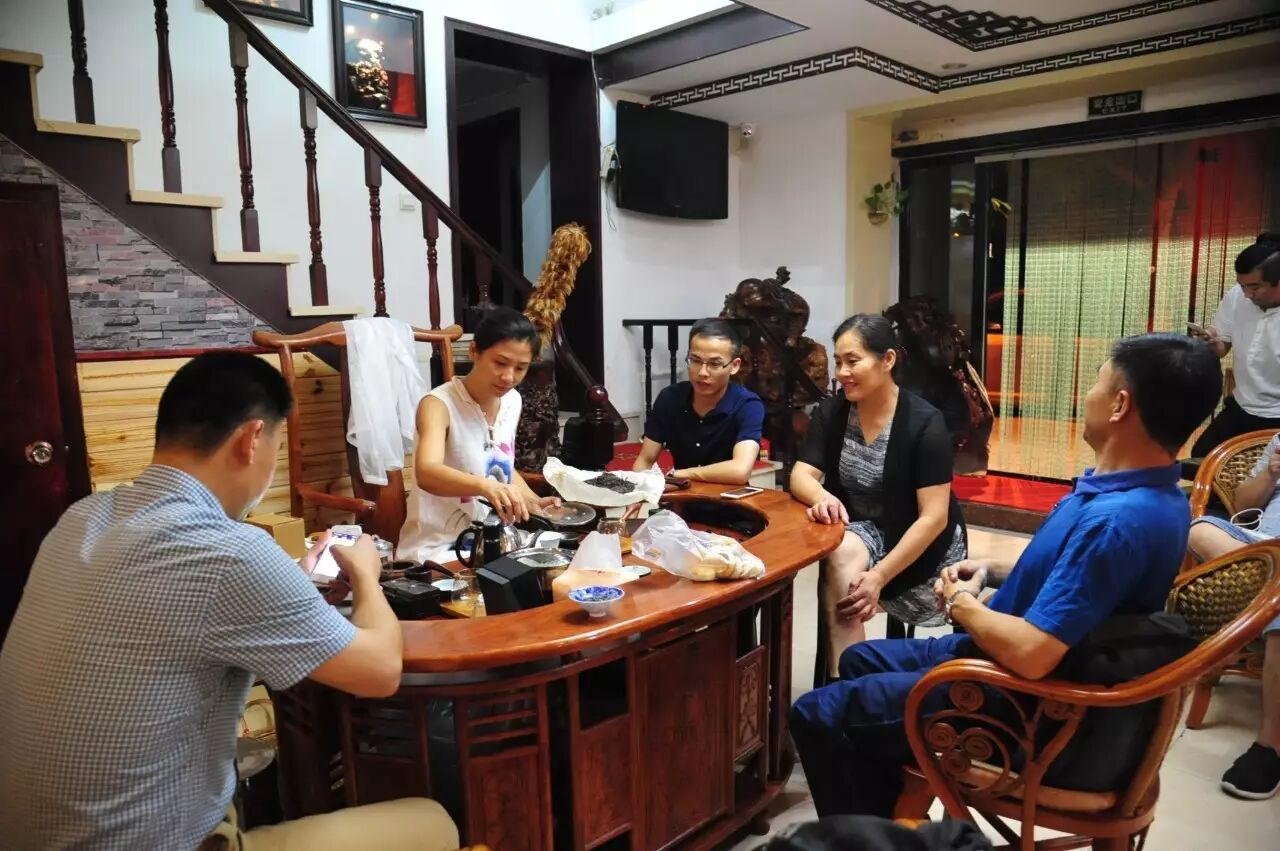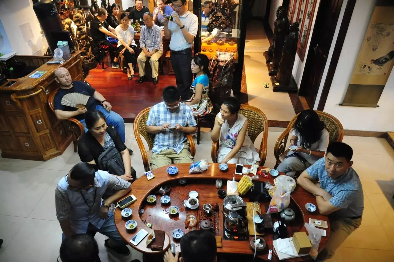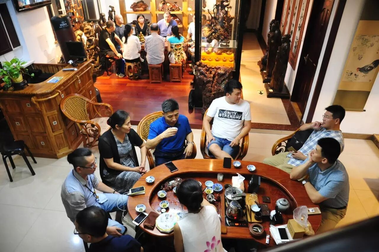 整场茶会,主人拿出来两款茶,虽然是两款茶,不用七碗一样喝到深夜,一样的醉人。一款是2014年漭水古树茶,一款是90年代的7542(又名88青,90前后的88青大拍卖公司的拍卖价一饼357g的数万元)。水遇茶香,好茶自然有爱茶人结缘。2014年漭水古树是西双版纳产区的,却透着易武的柔美,水路细腻,不愠不火。10泡后,熙秀苑王总投入最有降压作用的海南黄花梨,茶汤更浓入口更顺。90年代的7542是经过了云南、广东的洗礼,岁月的积淀,已经把这份茶内在的内含物展现出来,两桌两壶,好客的主人让大家切实感受到如坐春风的热情。