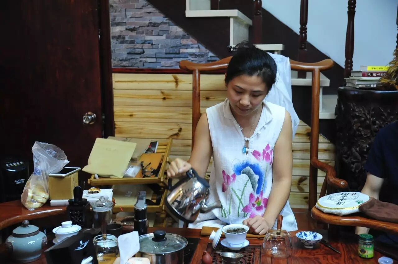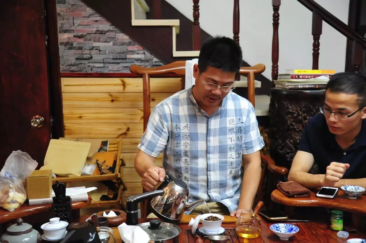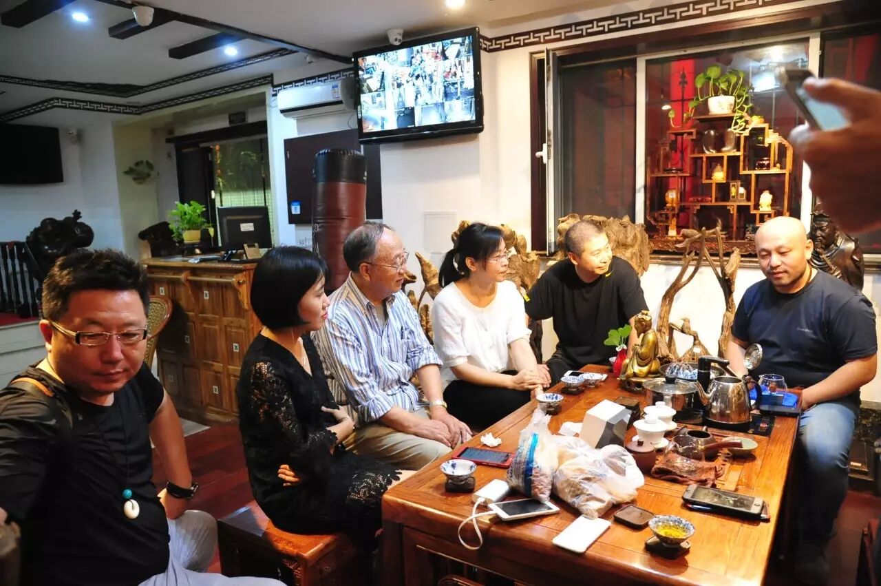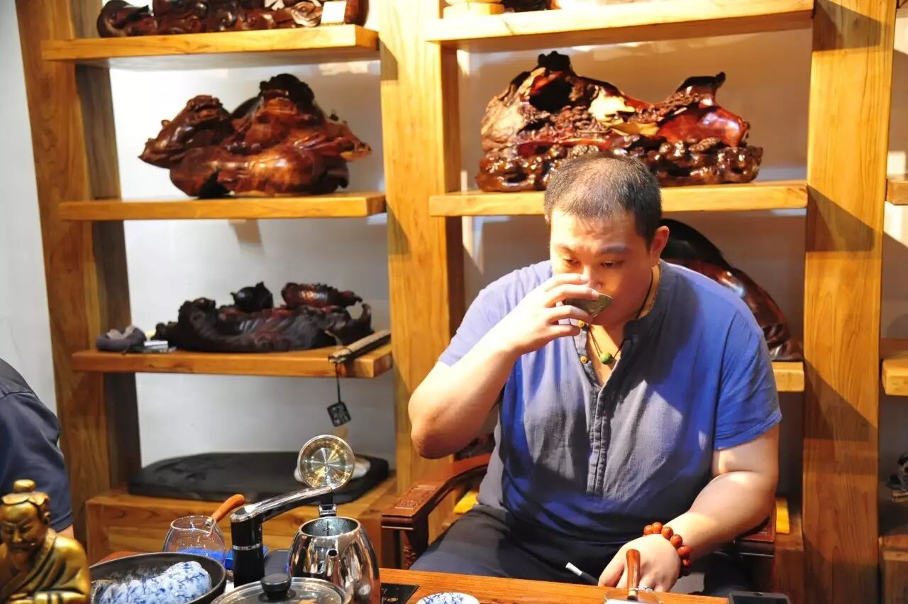 整场茶会,主人拿出来两款茶,虽然是两款茶,不用七碗一样喝到深夜,一样的醉人。一款是2014年漭水古树茶,一款是90年代的7542(又名88青,90前后的88青大拍卖公司的拍卖价一饼357g的数万元)。水遇茶香,好茶自然有爱茶人结缘。2014年漭水古树是西双版纳产区的,却透着易武的柔美,水路细腻,不愠不火。10泡后,熙秀苑王总投入最有降压作用的海南黄花梨,茶汤更浓入口更顺。90年代的7542是经过了云南、广东的洗礼,岁月的积淀,已经把这份茶内在的内含物展现出来,两桌两壶,好客的主人让大家切实感受到如坐春风的热情。