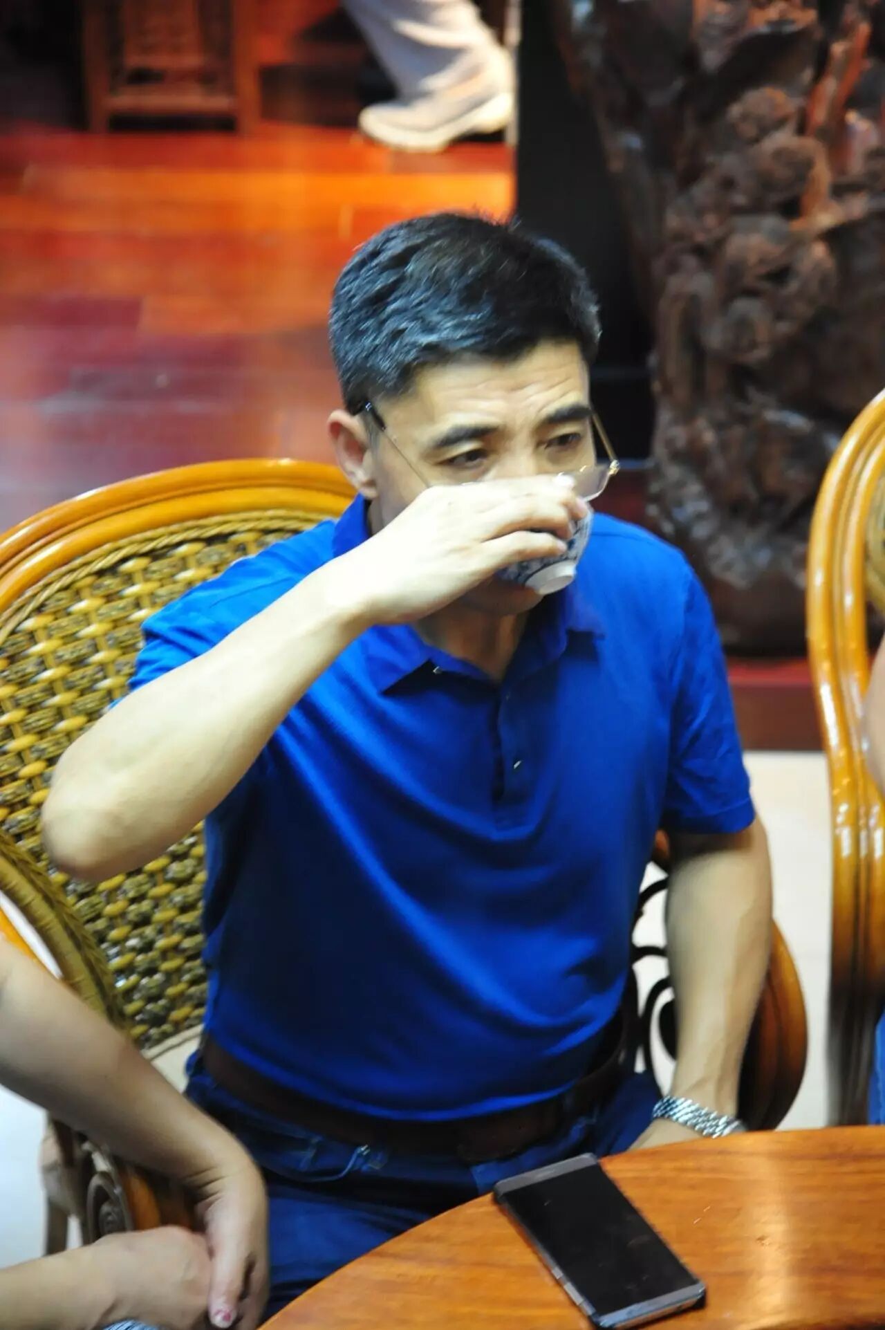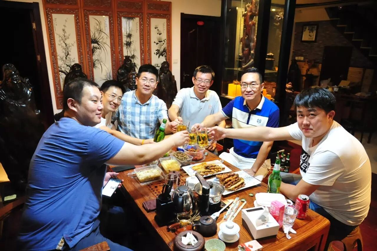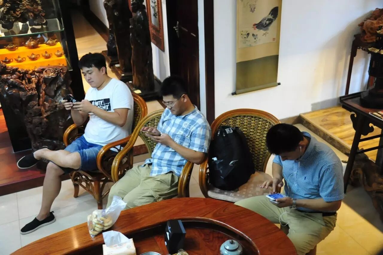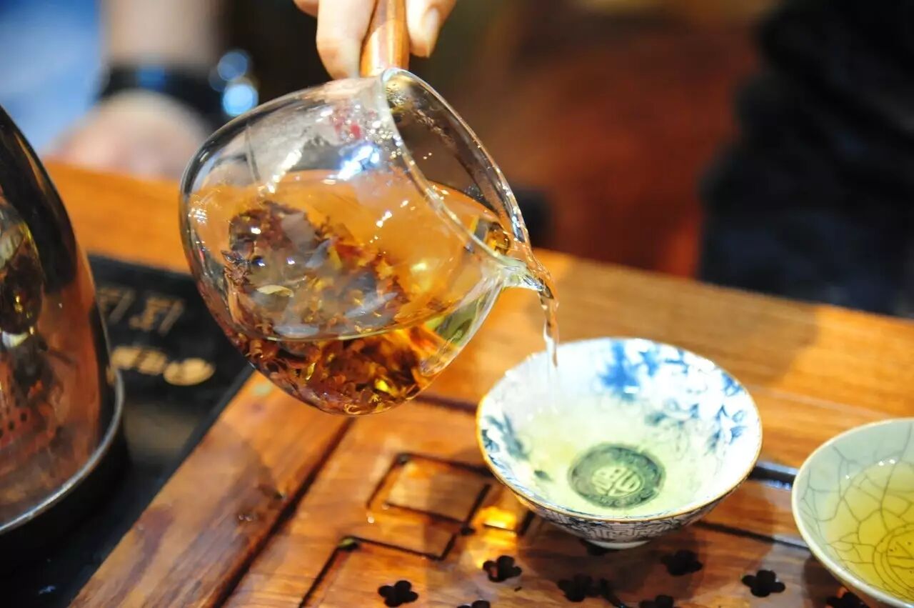 整场茶会,主人拿出来两款茶,虽然是两款茶,不用七碗一样喝到深夜,一样的醉人。一款是2014年漭水古树茶,一款是90年代的7542(又名88青,90前后的88青大拍卖公司的拍卖价一饼357g的数万元)。水遇茶香,好茶自然有爱茶人结缘。2014年漭水古树是西双版纳产区的,却透着易武的柔美,水路细腻,不愠不火。10泡后,熙秀苑王总投入最有降压作用的海南黄花梨,茶汤更浓入口更顺。90年代的7542是经过了云南、广东的洗礼,岁月的积淀,已经把这份茶内在的内含物展现出来,两桌两壶,好客的主人让大家切实感受到如坐春风的热情。