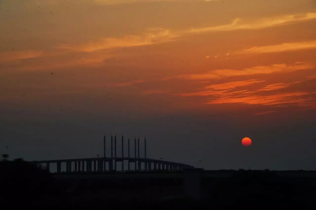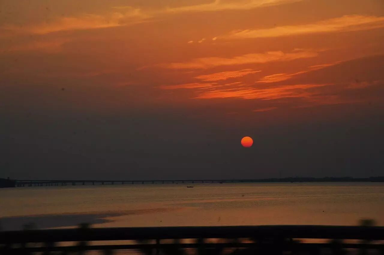 是日遥望跨海大桥的落日:跨海大桥平野阔,海天落日垂星圆。