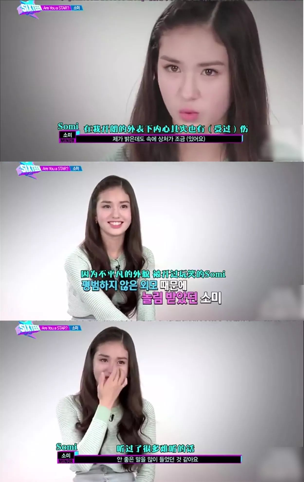 拥有韩国、加拿大、荷兰三国混血的她,在十分排外的韩国读书时,也曾被同学骂过杂种。somi在参加《SIXTHTENN》时,就曾提及在学校里被孤立的往事。