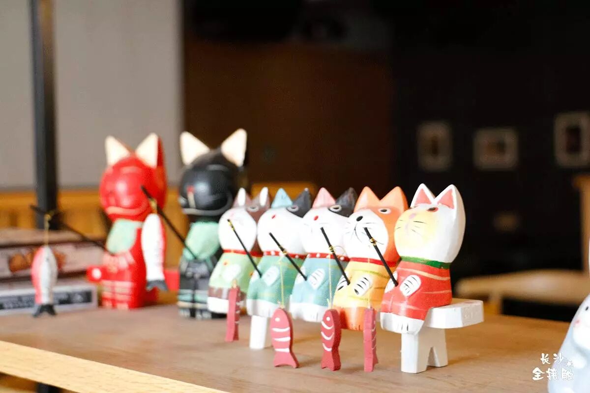 餐桌旁边的架子上面摆着很多玩偶,猫类的玩偶占了很大一部分,看来店长真的是绝对爱猫主义者了~