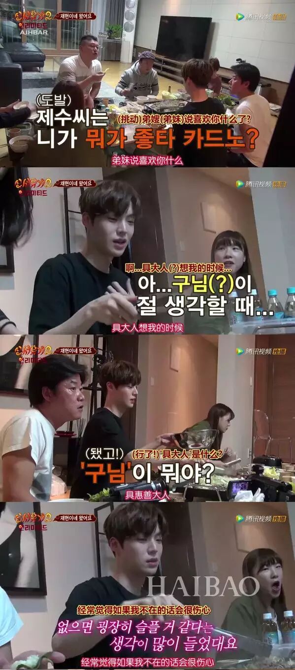 被发现恋爱的时候已经开始计划结婚,从来没有大声吵过架,两个人都不会为了赢对方而吵架。节目里做游戏给自己的爱人发短信,最快收到我爱你的短信获胜。安宰贤发出“老婆我爱你”之后,最快的收到了回复,意料之中的获胜。还曝光了安宰贤对具惠善的爱称——“具大人”,坦诚的一言一语里都透着准新郎的幸福感。明明是几个大男人的《新西游记》却莫名有了一种《我结》即视感,只不过女主角没在。