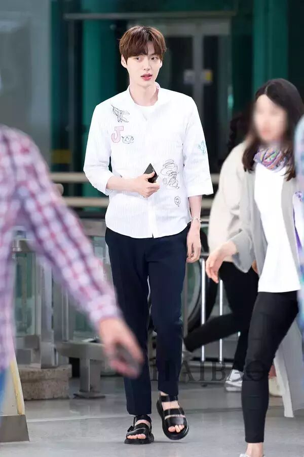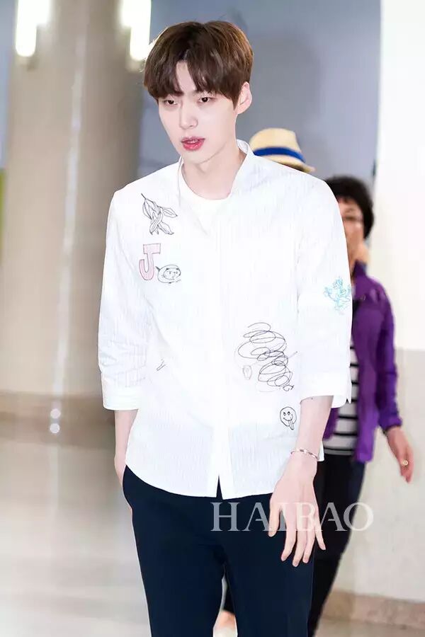 安宰贤2016年5月9日韩国金浦机场街拍:身着自己品牌AA.Gban与Chris.christy的合作款衬衫前往济州岛