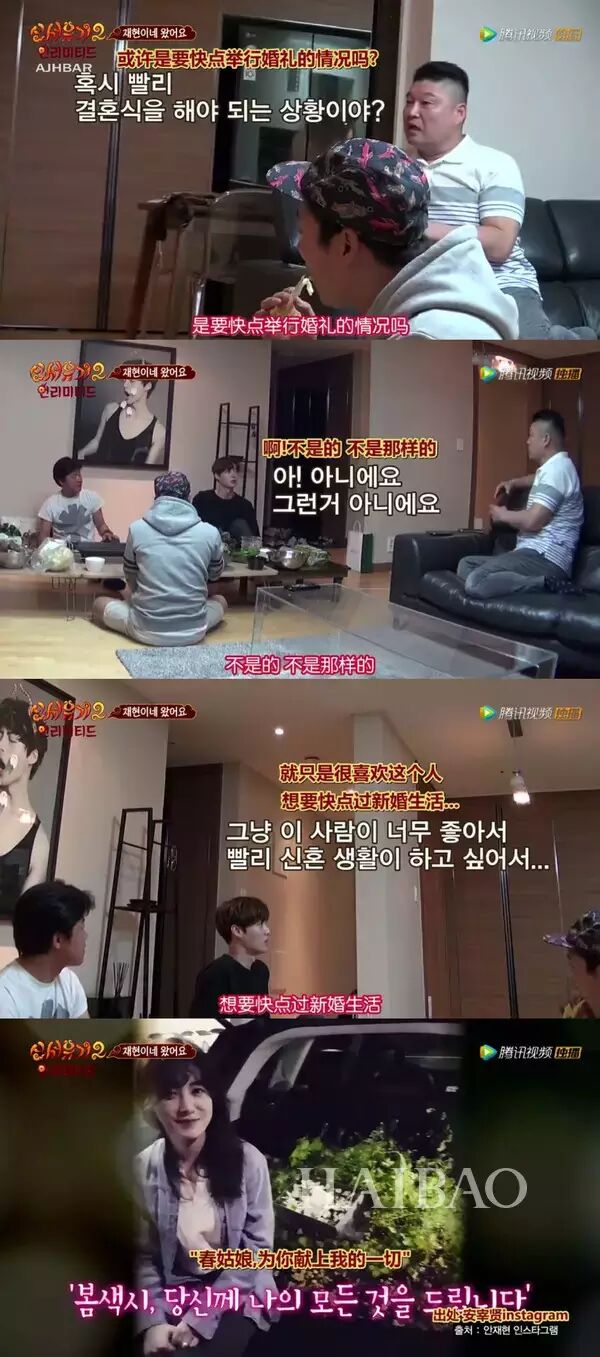 安宰贤被问到这么早结婚是不是有啥原因来着的时候说:“因为太喜欢她了 所以迫不及待地想和她一起享受婚后生活”