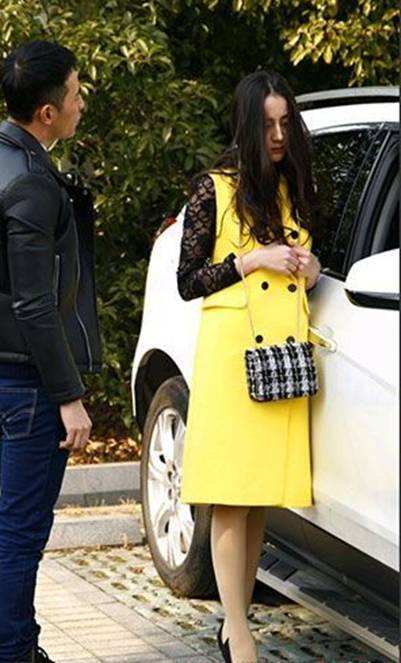 柠檬黄双排扣无袖长马甲内搭黑色透视蕾丝裙,这身装扮也着装迷人养眼呢,搭配肤色丝袜和黑色高跟鞋,拎着黑白灰花呢链条包,楚楚可怜的样子,很令人心动。