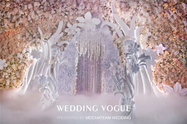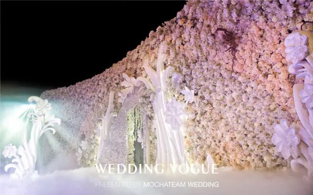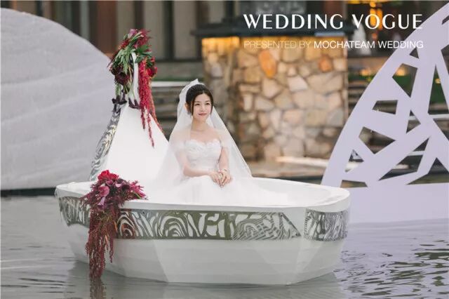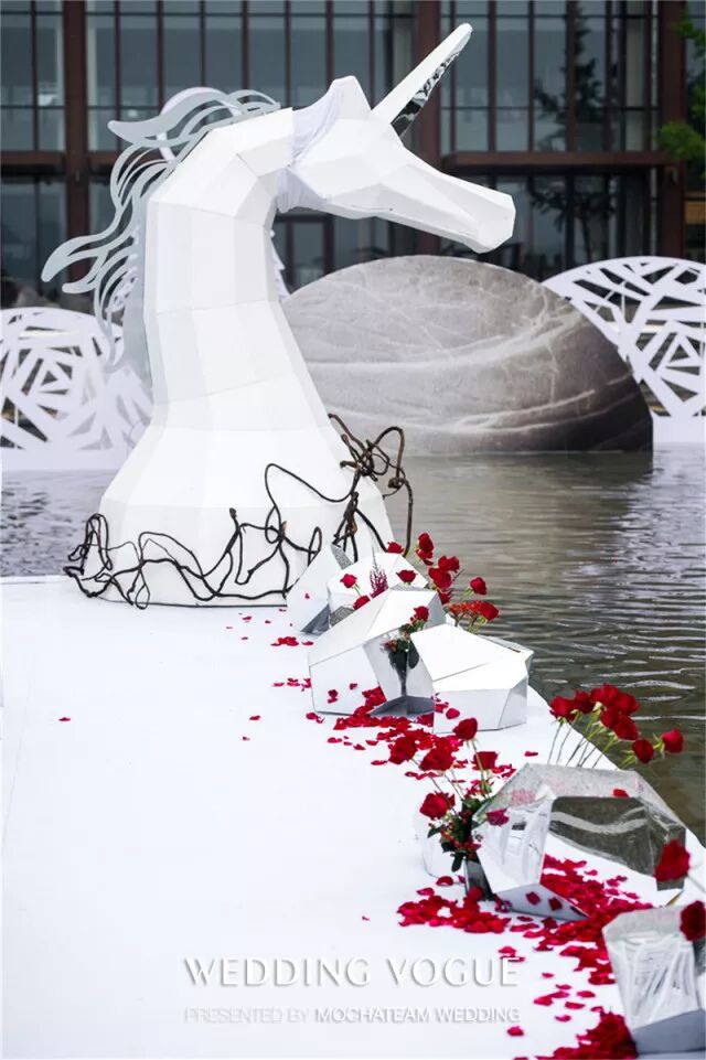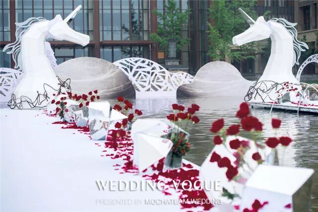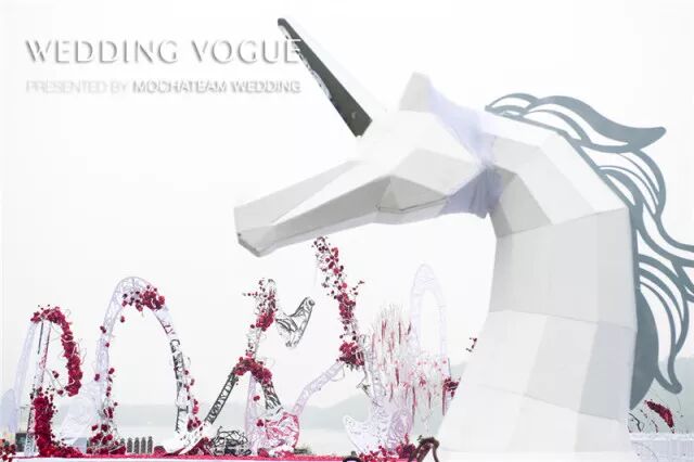 陈晓和陈妍希的婚礼整场色系以白红为主,因为婚礼仪式是在户外举行,神兽镇守爱之路,迎接女神到来,花船通过时神兽点头以表敬畏,同时增加仪式感。