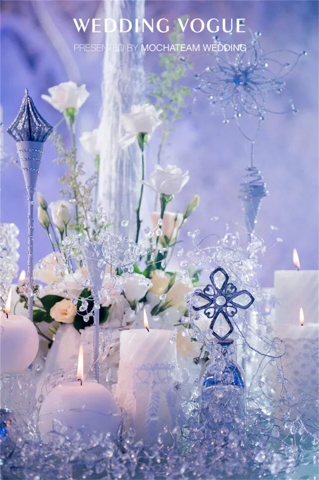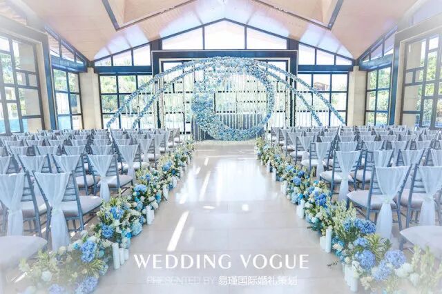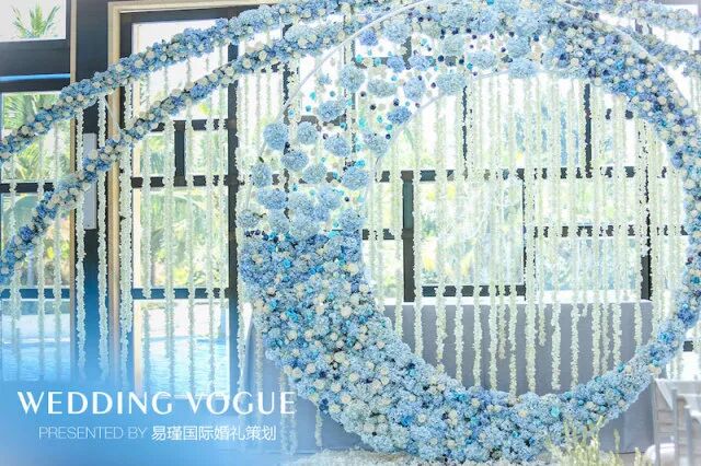 朱孝天和韩雯雯的婚礼主要以蓝色为主,以花朵装饰,清新简单,美丽大方。