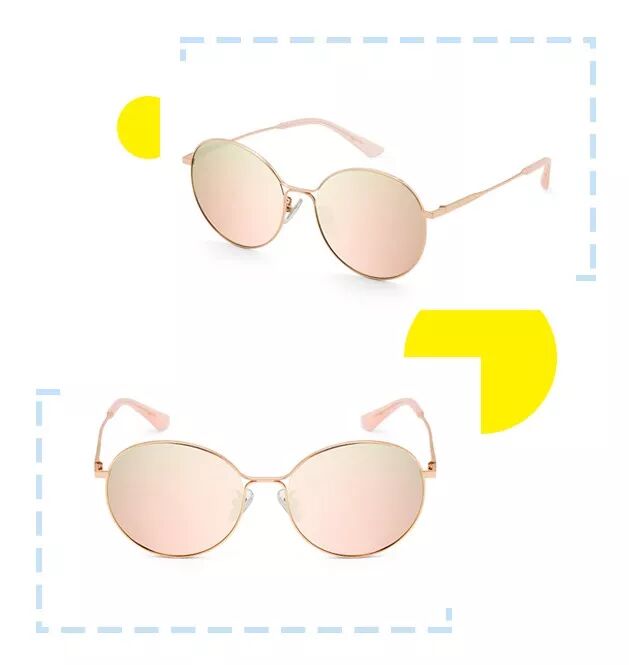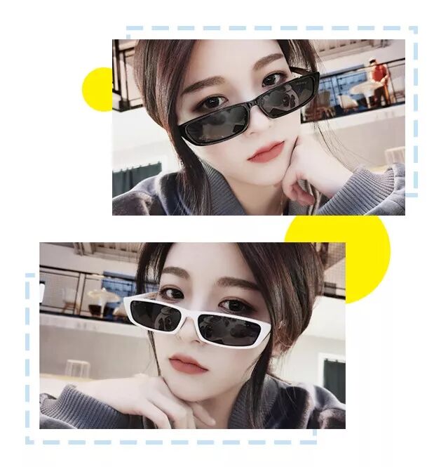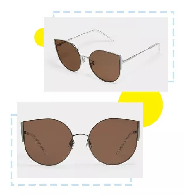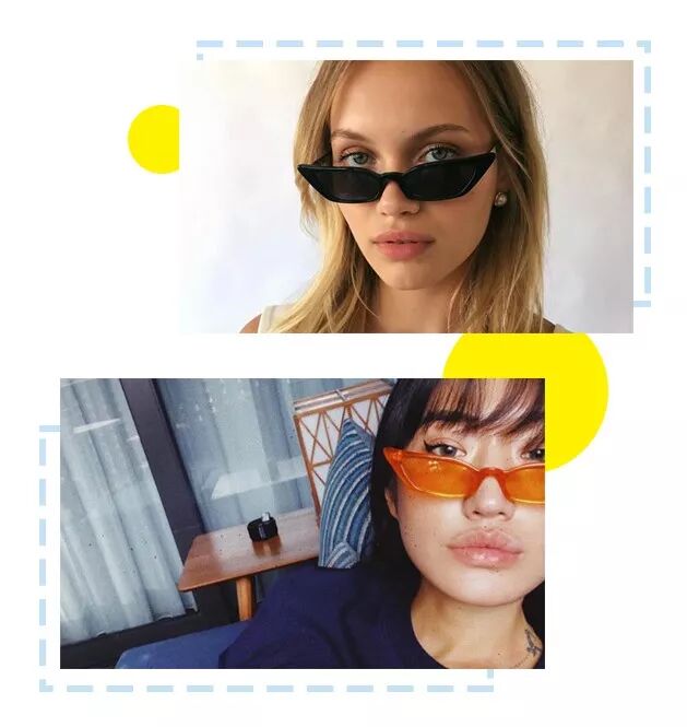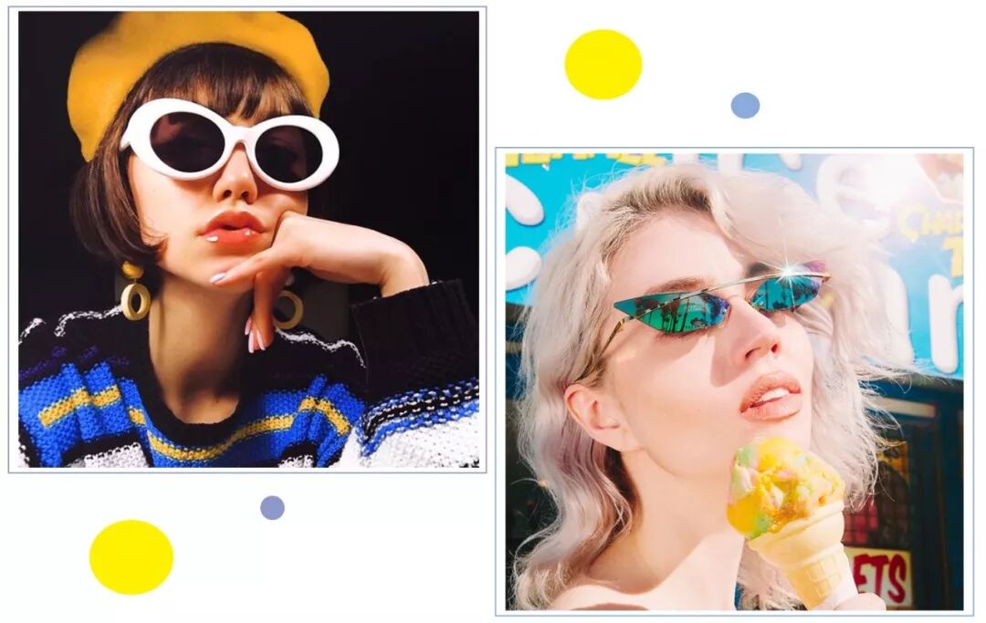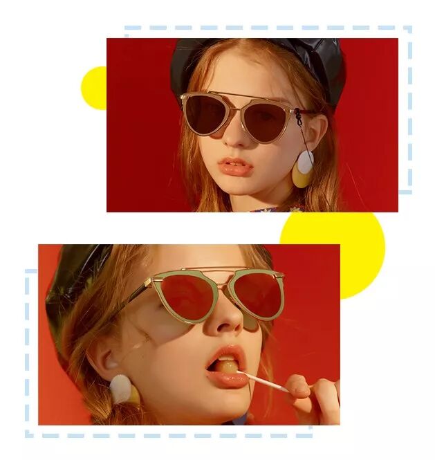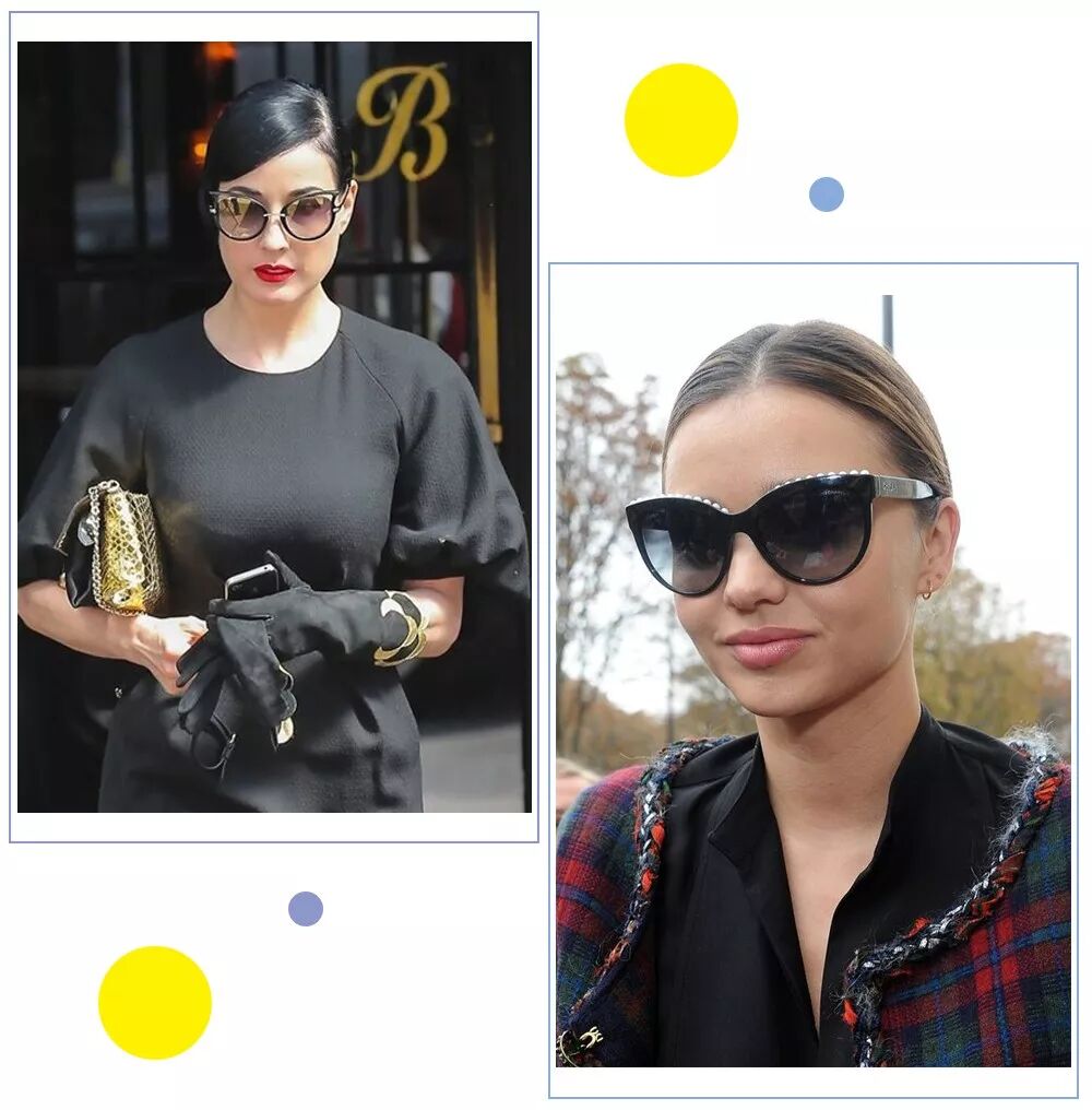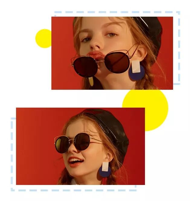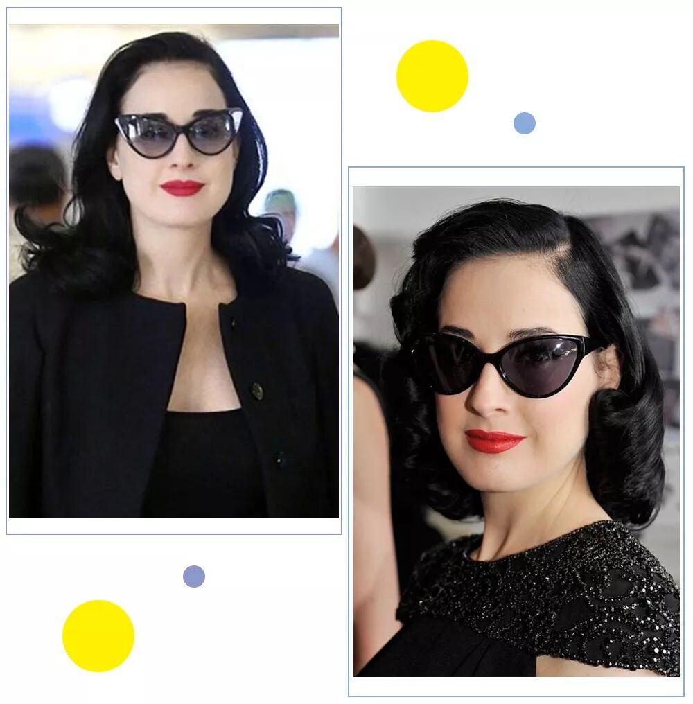 所以猫眼墨镜上扬的尾巴,超出颧骨的宽度,使得戴上它就能让太阳穴看起来更加饱满,从而在视觉上让下半张脸变窄,下巴变尖。(圆脸宝宝看过来~)