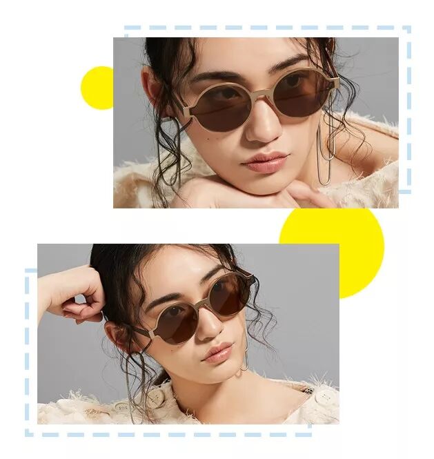 圆形的墨镜对脸型要求是出了名的高,它更适合鹅蛋脸、瓜子脸的尖下巴星人。圆形的轮廓可以弱化过于尖锐的下巴,起到平衡脸部线条的作用。