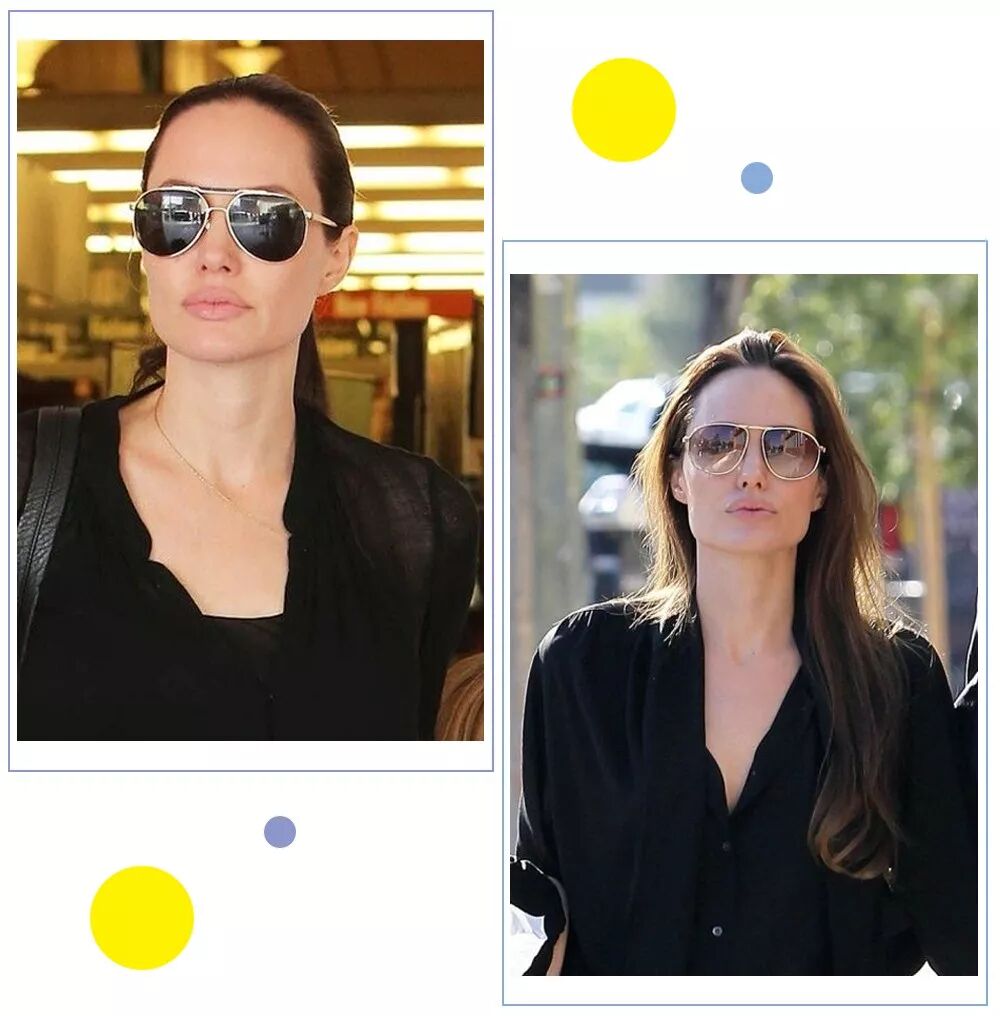 像赛琳娜这样佩戴加大加宽的款式,镜片覆盖住颧骨,把脸上的肉肉最大幅度地遮起来,才可以更好地缩小脸部噢~