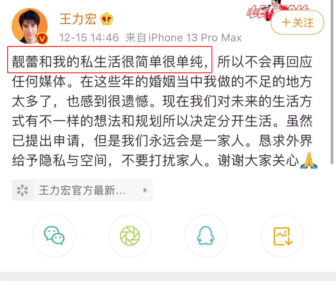 12月15日,王力宏公开宣布与结婚8年的妻子李靓蕾离婚,并自称私生活很简单很单纯。