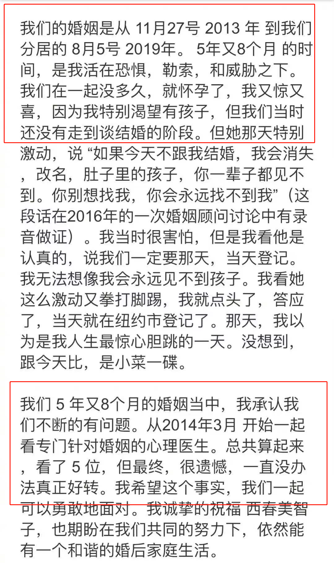 他还提到从2014年3月开始,他们一共看了5位心理医生,用来解决婚姻里面的问题。