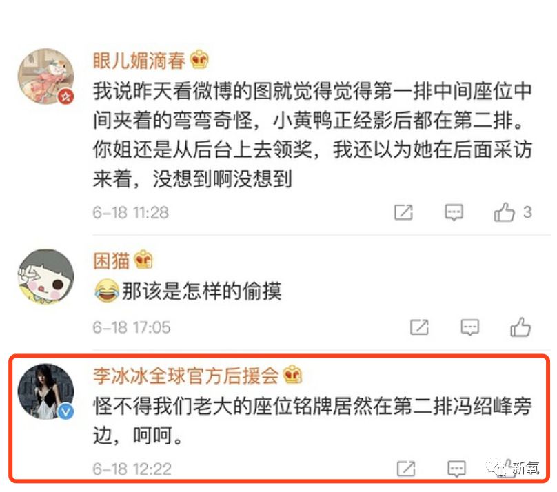 这个爆料看得迷死氧一愣一愣的,完全不敢信还有这种操作,结果没想到这个爆料还得到了李冰冰官方后援会的盖戳。就在这条爆料微博的评论里,李冰冰全球官方后援会说:怪不得我老大的座位名牌居然在第二排冯绍峰旁边。