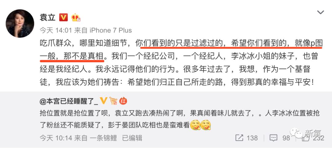 有网友说袁立凑热闹“闻着味儿就去了”,袁立直接转发了她的微博说自己曾经和李冰冰一个经纪公司,一个经纪人,自己永远记得他们的行为,还说网友看到的都不是真相。