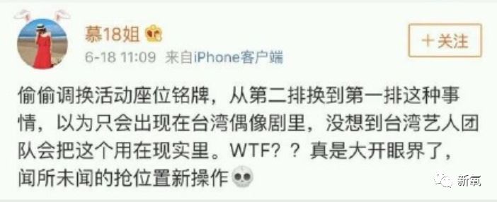 在微博电影之夜的活动结束之后,有人在微博上爆料说,某个台湾艺人团队把自己的座位偷偷调换了,本来这个台湾艺人是坐在第二排的,结果偷偷把自己的名牌贴到了第一排去。