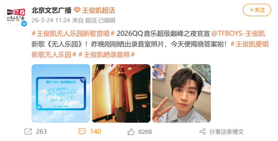 今晚王俊凯将在QQ音乐巅峰之夜首次现场演唱新歌《无人乐园》,这也是该曲目的舞台首秀。